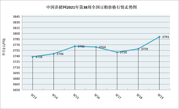 猪价系统数据监测,2021年第38周(2021年9月13日至2021年9月19日)本周豆粕价格周内以小幅上涨为主,周中豆粕价格呈现下跌,周中下跌后又有所上涨,整体呈现小幅上涨。全周豆粕价格区间在3738-3791元/吨之间,周初豆粕价格为3738元/吨,周末价格为3791元/吨,全周豆粕价格累计上涨了53元/吨。