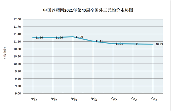 猪价系统数据监测,2021年第40周(2021年9月27日至2021年10月03日)全国外三元生猪价格走势整体呈现涨跌互现趋势,周中猪价小幅下跌,周末猪价持续下跌。本周猪价区间在10.99-11.26元/公斤之间!周初猪价为11.26元/公斤,周末猪价为10.99元/公斤,全周猪价累计下跌了0.27元/公斤。