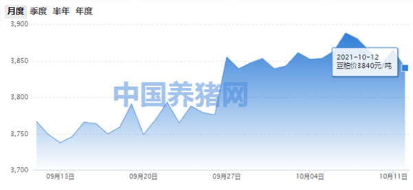 2021年10月12日(星期二),今日全国豆粕均价为3840元/吨,报价较昨日下跌了25元/吨,环比上涨2.71%,同比上涨16.89%。