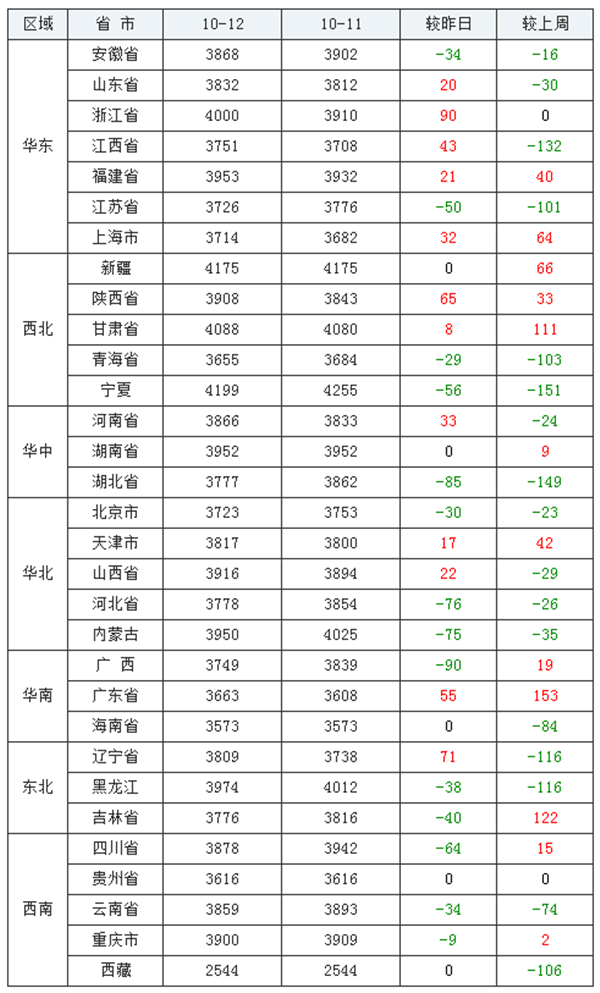 上涨地区(11个):山东省、浙江省、江西省、福建省、上海市、陕西省、甘肃省、河南省、天津市、山西省、辽宁省;涨幅为8-90元/吨。