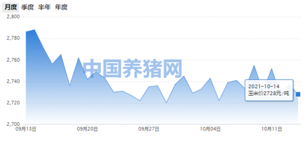 2021年10月14日(星期四),今日全国玉米均价为2728元/吨,报价较昨日下跌了9元/吨,环比下跌2.15%,同比上涨16.33%。