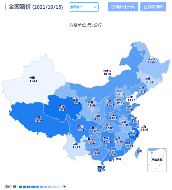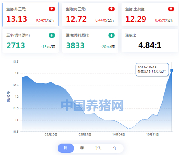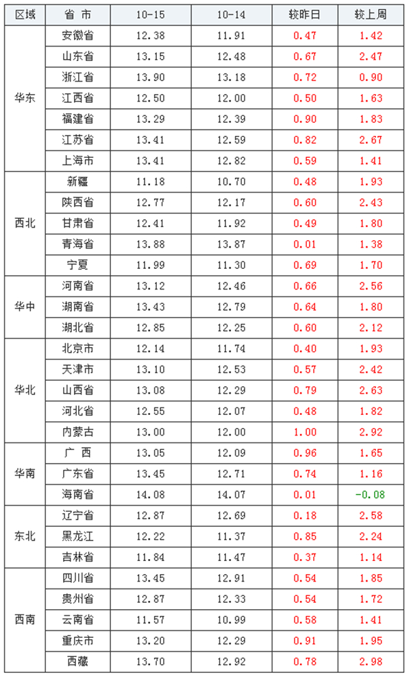 相较昨日(2021年10月15日)12.59元/公斤,价格上涨0.54元/公斤;