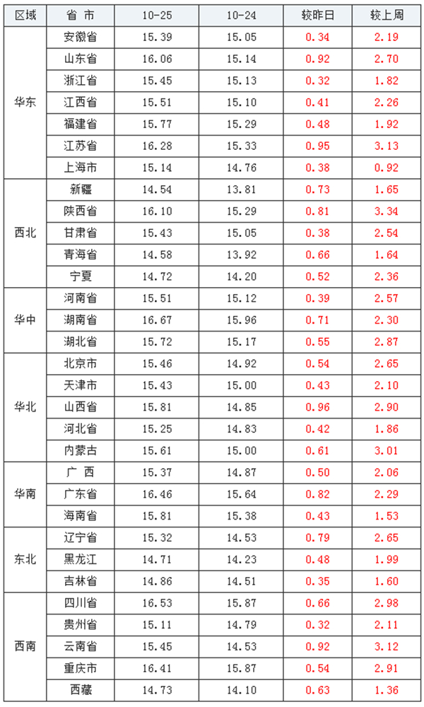 相较昨日(2021年10月24日)15.16元/公斤,价格上涨0.89元/公斤;