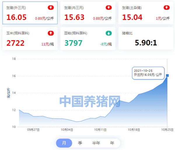 中国外三元生猪(外三元)价格为16.05元/公斤;