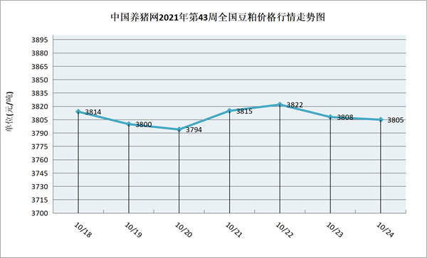 猪价系统 数据监测,2021年第43周(2021年10月18日至2021年10月24日)本周豆粕价 格周内以震荡调整为主,周中豆粕价 格涨跌互现,周中上涨后有所下跌,整体呈现小幅下跌的行情。全周 豆粕 价格区间在3794-3822元/吨之间,周初豆粕价 格为3814元/吨,周末价格为3805元/吨,全周豆粕价 格累计下跌了9元/吨。