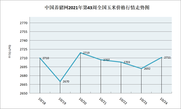 猪价系统 数据监测,2021年第43周(2021年10月18日至2021年10月24日)本周我国 玉米价 格整体依然以震荡调整为主。玉米价格先 小幅下跌后又上涨,周中和周末又持续下跌。全周玉米价格区 间在2670-2719元/吨,周初期玉米价格为 2710元/吨,周末期价格为2711元/吨,全周玉米价格累 计下跌了1元/吨。