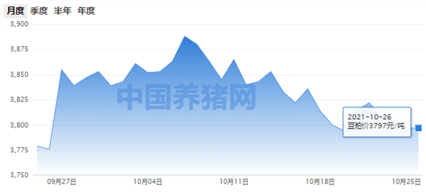 2021年10月26日(星期二),今日全国豆粕均价为3797元/吨,报价较昨日持平,环比上涨0.56%,同比上涨12.80%。