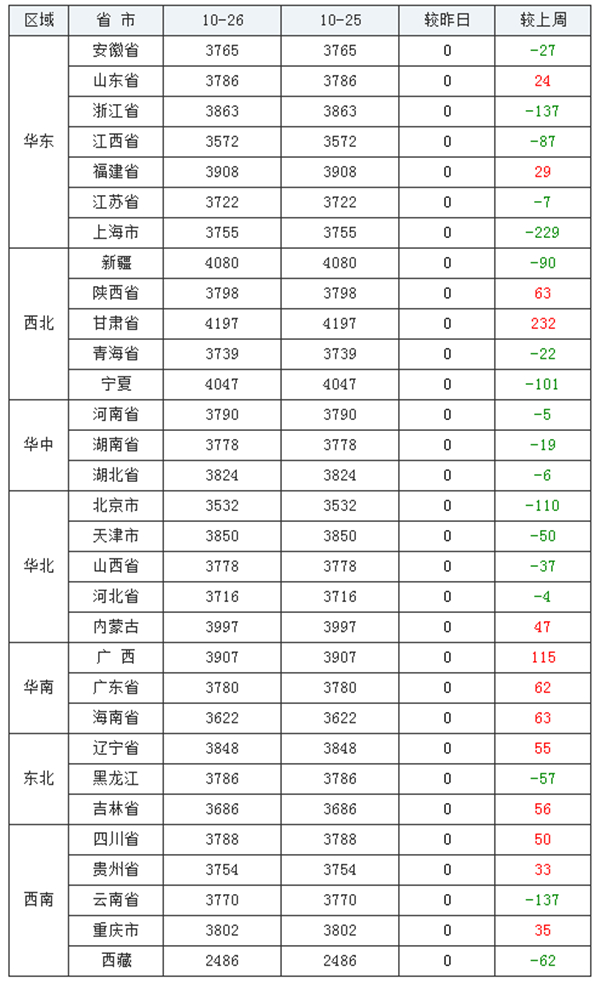 今日国内豆粕价格较昨日整体都呈现持平状态,较上周相比华南、东北、西南地区豆粕价格呈现上涨行情,涨幅为24-232元/吨,最低为山东省,最高为甘肃省。华东、华中、华北地区呈现下跌为主,整体跌幅为4-229元/吨,最低为河北省,最高为上海市。据了解,由于国内进口大豆到港量下降,油厂大豆压榨量提升导致豆粕产出增加。随着气温的降低,养殖业对饲料需求的增加使得饲料养殖企业提货速度加快,豆粕库存呈现下降趋势。豆油高位暴跌提升油厂挺粕动力,为豆粕价格暂时回升提供支撑。预计国内豆粕仍处于震荡运行走势。