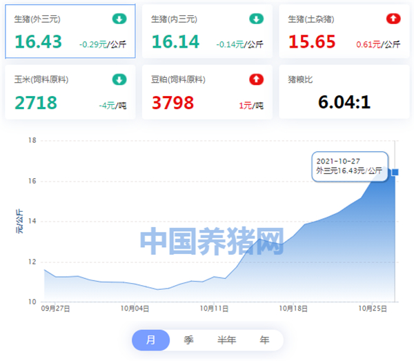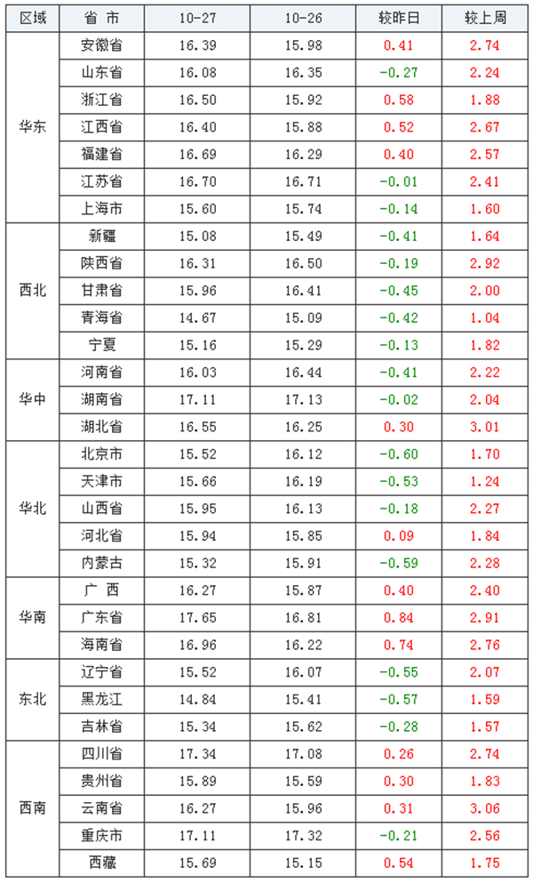 相较昨日(2021年10月26日)16.72元/公斤,价格下跌0.29元/公斤;