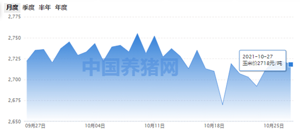 2021年10月27日(星期三),今日全国玉米均价为2718元/吨,报价较昨日下跌4元/吨,环比下跌0.62%,同比上涨11.48%。