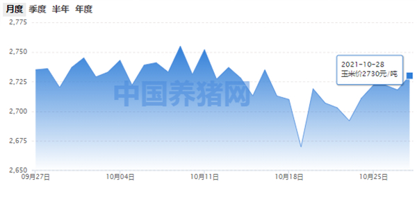 2021年10月28日(星期四),今日全国玉米均价为2730元/吨,报价较昨日上涨12元/吨,环比下跌0.22%,同比上涨11.70%。