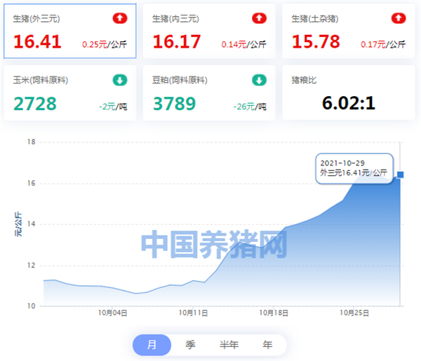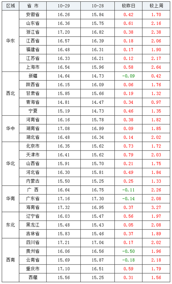 相较昨日(2021年10月28日)16.16元/公斤,价格上涨0.25元/公斤;