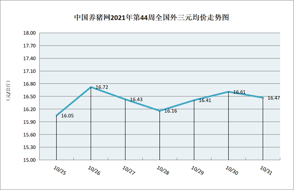 猪价系统数据监测,2021年第44周(2021年10月25日至2021年10月31日)全国外三元生猪价格走势整体呈现涨跌互现趋势,周中猪价小幅下跌,周末猪价上涨再下跌。本周猪价区间在10.05-16.72元/公斤之间!周初猪价为16.05元/公斤,周末猪价为16.47元/公斤,全周猪价上涨了0.42元/公斤。