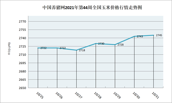 猪价系统数据监测,2021年第44周(2021年10月25日至2021年10月31日)本周我国玉米价格整体以持续上涨为主。玉米价格先小幅下跌后又上涨,周中和周末又持续上涨。全周玉米价格区间在2718-2745元/吨,周初期玉米价格为2722元/吨,周末期价格为2745元/吨,全周玉米价格累计上涨了23元/吨。