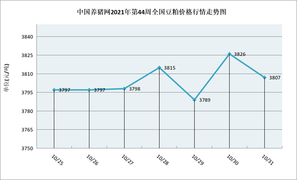猪价系统数据监测,2021年第44周(2021年10月25日至2021年10月31日)本周豆粕价格周内以震荡调整为主,周中豆粕价格呈现上涨,周中上涨后有所下跌,整体呈现涨跌互现。全周豆粕价格区间在3789-3826元/吨之间,周初豆粕价格为3797元/吨,周末价格为3807元/吨,全周豆粕价格累计上涨了10元/吨。