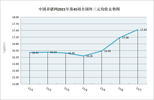猪价系统数据监测,2021年第45周(2021年11月01日至2021年11月07日)全国外三元生猪价格走势整体呈现小幅上涨趋势,周中猪价小幅下跌,周末猪价持续上涨。本周猪价区间在16.26-17.44元/公斤之间!周初猪价为16.41元/公斤,周末猪价为17.44元/公斤,全周猪价上涨了1.03元/公斤。