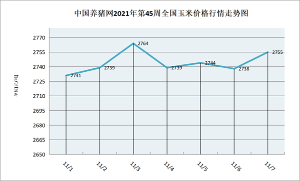 猪价系统数据监测,2021年第45周(2021年11月01日至2021年11月07日)本周我国玉米价格整体以震荡上涨为主。玉米价格先小幅上涨后又下跌,周中和周末又震荡上涨。全周玉米价格区间在2731-2764元/吨,周初期玉米价格为2731元/吨,周末期价格为2755元/吨,全周玉米价格累计上涨了24元/吨。