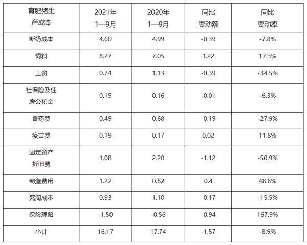表1 公司育肥猪2021年1-9月与2020年同期生产成本比较