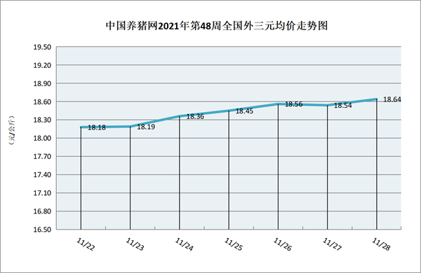 猪价系统数据监测,2021年第48周(2021年11月22日至2021年11月28日)全国外三元生猪价格走势整体呈现小幅上涨趋势,周中猪价小幅上涨,周末猪价呈现上涨。本周猪价区间在18.18-18.64元/公斤之间!周初猪价为18.18元/公斤,周末猪价为18.64元/公斤,全周猪价上涨了0.46元/公斤。
