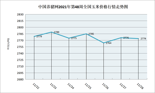猪价系统数据监测,2021年第48周(2021年11月22日至2021年11月28日)本周我国玉米价格整体呈现涨跌互现趋势。玉米价格先小幅上涨后又下跌,周中和周末又震荡调整。全周玉米价格区间在2764-2789元/吨,周初期玉米价格为2779元/吨,周末期价格为2774元/吨,全周玉米价格累计上下跌了5元/吨。