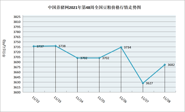 猪价系统数据监测,2021年第48周(2021年11月22日至2021年11月28日)本周豆粕价格周内以涨跌互现为主,周中豆粕价格呈现涨跌互现,周中下跌后又有所上涨,整体呈现小幅下跌。全周豆粕价格区间在3627-3738元/吨之间,周初豆粕价格为3737元/吨,周末价格为3682元/吨,全周豆粕价格累计下跌了55元/吨。