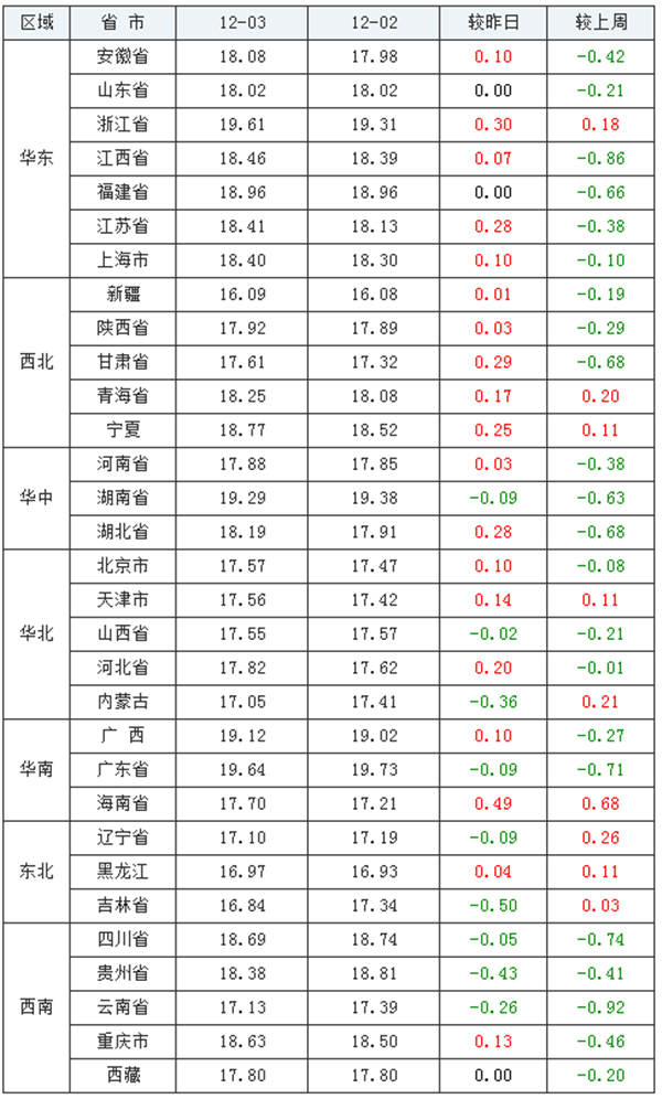相较昨日(2021年12月02日)18.18元/公斤,价格上涨0.01元/公斤;