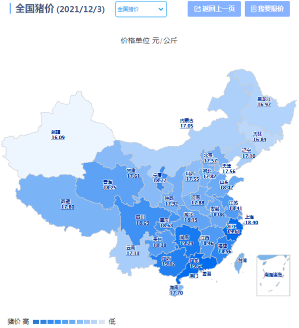 行情在近期持续反弹主要还是由于年底终端需求较为旺盛导致的,由于前大半年猪价持续处于成本底线之下,饲料疯涨,很多养猪人的扛价惜售情绪较为强烈,看涨情绪日益高涨,市场生猪出栏的小幅减少叠加市场需求利好,猪价在上月整体在“磕磕绊绊”中持续上涨,现如今已经大部分脱离亏损阶段,更有部分地区出现小幅盈利,这对于养猪行业来说无疑是福音。近期农业农村部畜牧兽医局副局长辛国昌在对目前猪价走势的看法和后期预测中表示,此番猪价上涨主要是前期养殖亏损,猪价受年底消费需求旺盛,拉动性恢复性上涨影响。从现在价格的绝对水平看,是处于比较合理的水平。