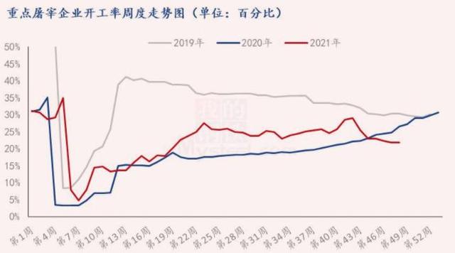 需求表现一般,国内屠宰企业开工率持续下滑,短期受冷空气以及周末利好略有回升!截止到今年第48周,国内屠企开工率降至21.86%,同比去年下降了4.71%!