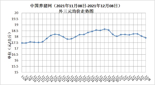 内三元生猪价格为17.73元/公斤(8.87元/斤),价格较昨日下跌了0.18元/公斤(0.09元/斤);土杂猪生猪价格为17.37元/公斤(8.69元/斤),价格较昨日上下跌了0.09元/公斤(0.05元/斤)。