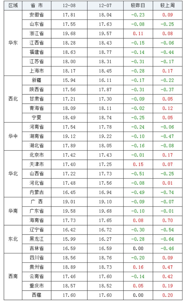 生猪(外三元)均价涨跌表”发现,今日国内可监测的31个省/市/自治区外三元生猪平均价格下跌了0.15元/公斤,跌幅为0.01-0.51元/公斤。其中山西省跌幅最大,下跌0.51元/公斤。今日全国生猪(外三元)价格呈现下跌趋势,具体表现为2个省/市/自治区猪价与昨日持平,24个省/市/自治区生猪价格与昨日相比出现下跌, 5个省/市/自治区猪价较昨日上涨,其中华东、西北、华中、华北以及东西地区猪价呈现上涨态势,其他地区呈小幅下跌。