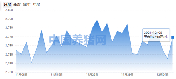 今日全国玉米均价为2769元/吨,报价较昨日上涨了24元/吨,环比上涨0.69%,同比上涨10.58%。