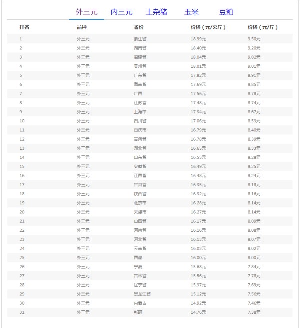 【1】浙江省猪价18.99元/公斤(9.50元/斤);