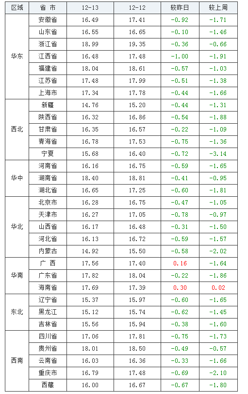 生猪(外三元)均价涨跌表”发现,今日国内可监测的31个省/市/自治区外三元生猪平均价格下跌了0.54元/公斤,跌幅为0.01-0.92元/公斤。其中安徽省跌幅最大,下跌0.92元/公斤。今日全国生猪(外三元)价格呈现下跌趋势,具体表现为29个省/市/自治区生猪价格与昨日相比出现下跌, 2个省/市/自治区猪价较昨日上涨,其中华东、西北、华中、华北、东北以及西南地区猪价呈现下跌趋势。