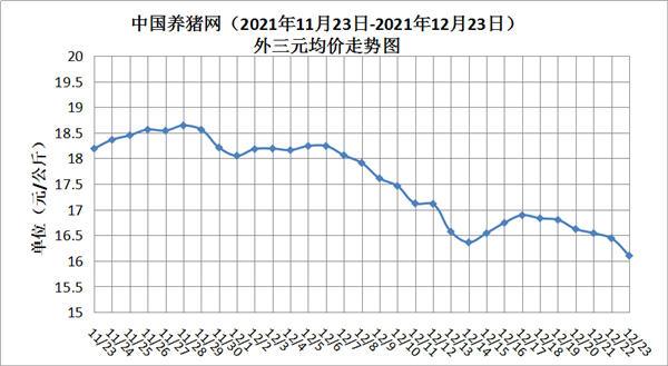 内三元生猪价格为16.11元/公斤(8.06元/斤),价格较昨日下跌了0.25元/公斤(0.13元/斤);土杂猪生猪价格为15.62元/公斤(7.81元/斤),价格较昨日下跌了0.24元/公斤(0.12元/斤)。