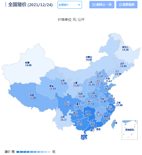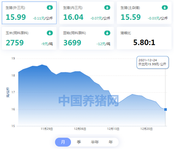 相较昨日(2021年12月23日)16.10元/公斤,价格下跌0.10元/公斤;