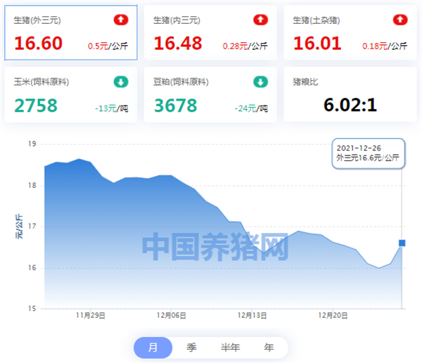 相较昨日(2021年12月25日)16.10元/公斤,价格上涨0.50元/公斤;