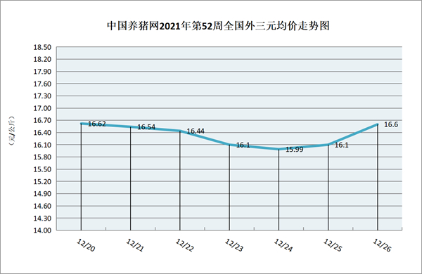 猪价系统数据监测,2021年第52周(2021年12月20日至2021年12月26日)全国外三元生猪价格走势整体呈现涨跌互现的趋势,周中猪价持续下跌,周末猪价呈现上涨。本周猪价区间在15.99-16.62元/公斤之间!周初猪价为16.62元/公斤,周末猪价为16.60元/公斤,全周猪价下跌了0.02元/公斤。