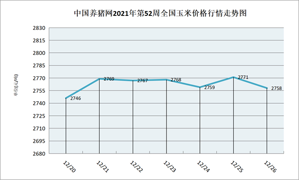 猪价系统数据监测,2021年第52周(2021年12月20日至2021年12月26日)本周我国玉米价格整体呈现涨跌互现的趋势。玉米价格先上涨后又下跌,周中和周末又震荡调整。全周玉米价格区间在2746-2771元/吨,周初期玉米价格为2746元/吨,周末期价格为2758元/吨,全周玉米价格累计上涨了12元/吨。