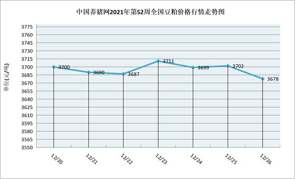 猪价系统数据监测,2021年第52周(2021年12月20日至2021年12月26日)本周豆粕价格周内以涨跌互现为主,周中豆粕价格呈现涨跌互现,周中上涨后又有所下跌,整体呈现小幅下跌。全周豆粕价格区间在3678-3711元/吨之间,周初豆粕价格为3700元/吨,周末价格为3678元/吨,全周豆粕价格累计下跌了22元/吨。