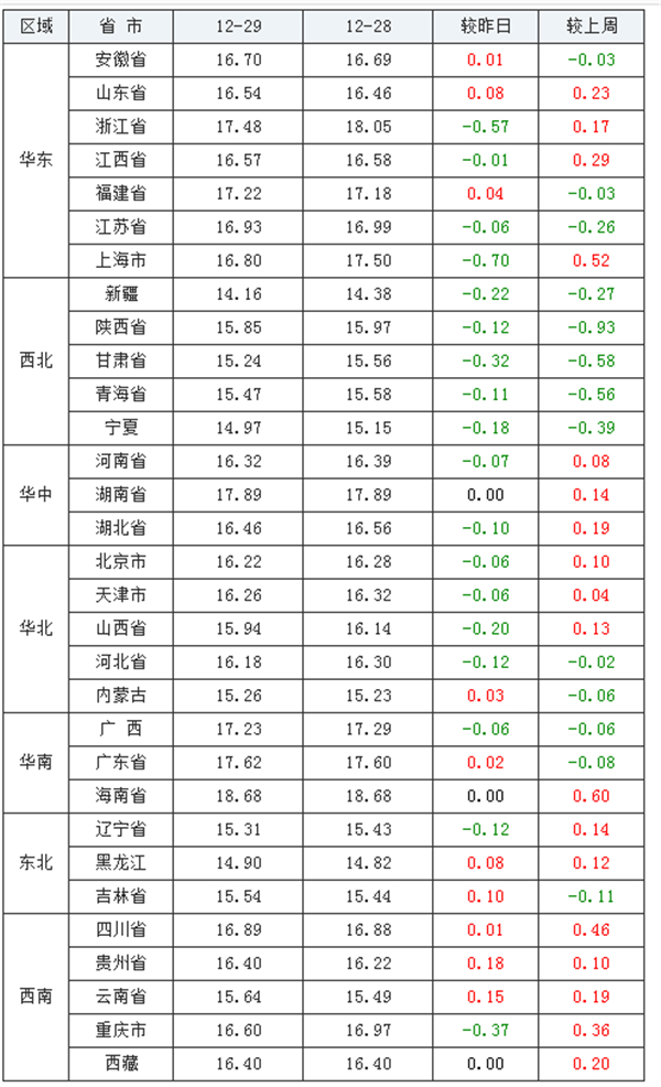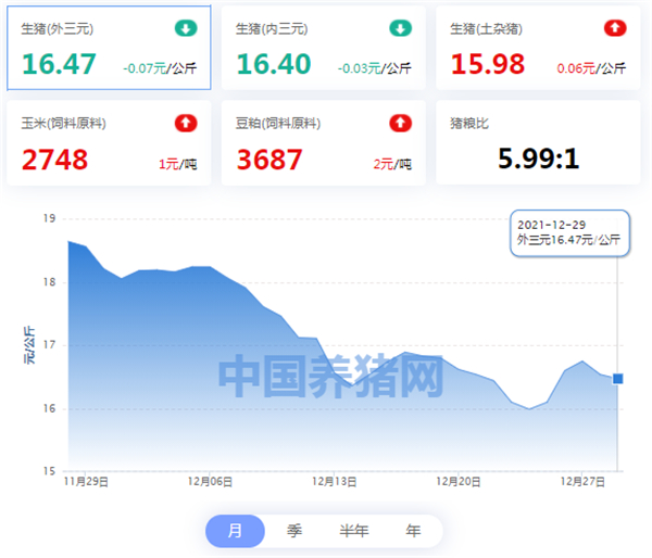 相较昨日(2021年12月28日)16.54元/公斤,价格下跌0.07元/公斤;
