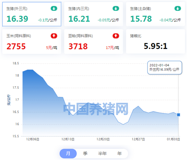 中国外三元生猪(外三元)价格为16.39元/公斤;