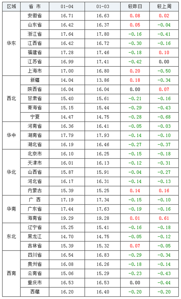 相较上周(2021年12月28日)16.54元/公斤,价格下跌0.15元/公斤;