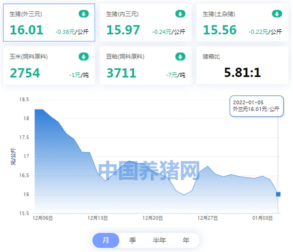 中国外三元生猪(外三元)价格为16.01元/公斤;
