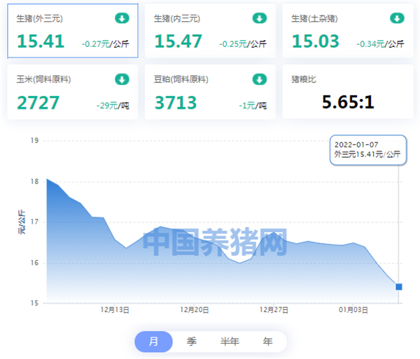 相较昨日(2022年01月06日)15.68元/公斤,价格下跌0.27元/公斤;