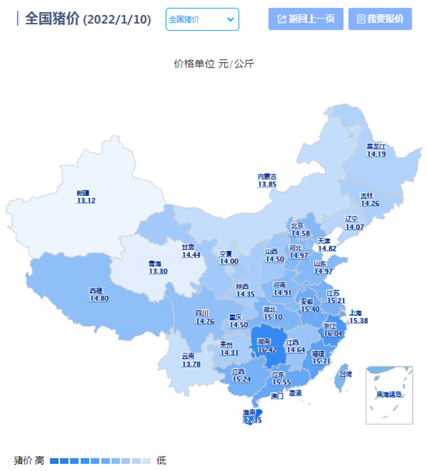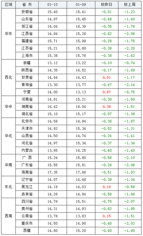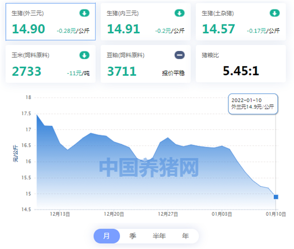 相较昨日(2022年01月09日)15.18元/公斤,价格下跌0.28元/公斤;