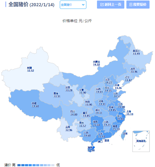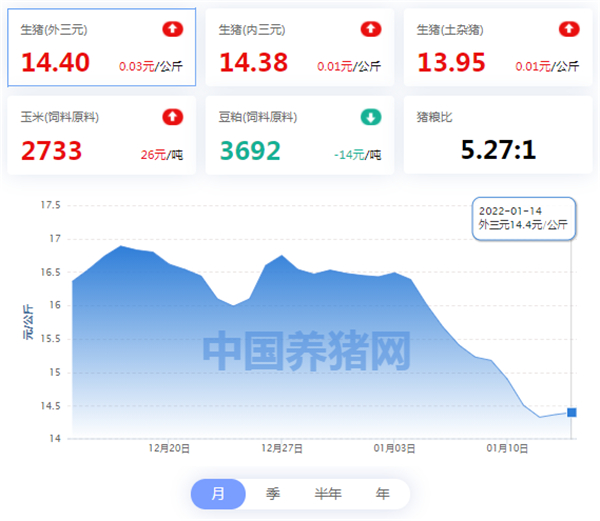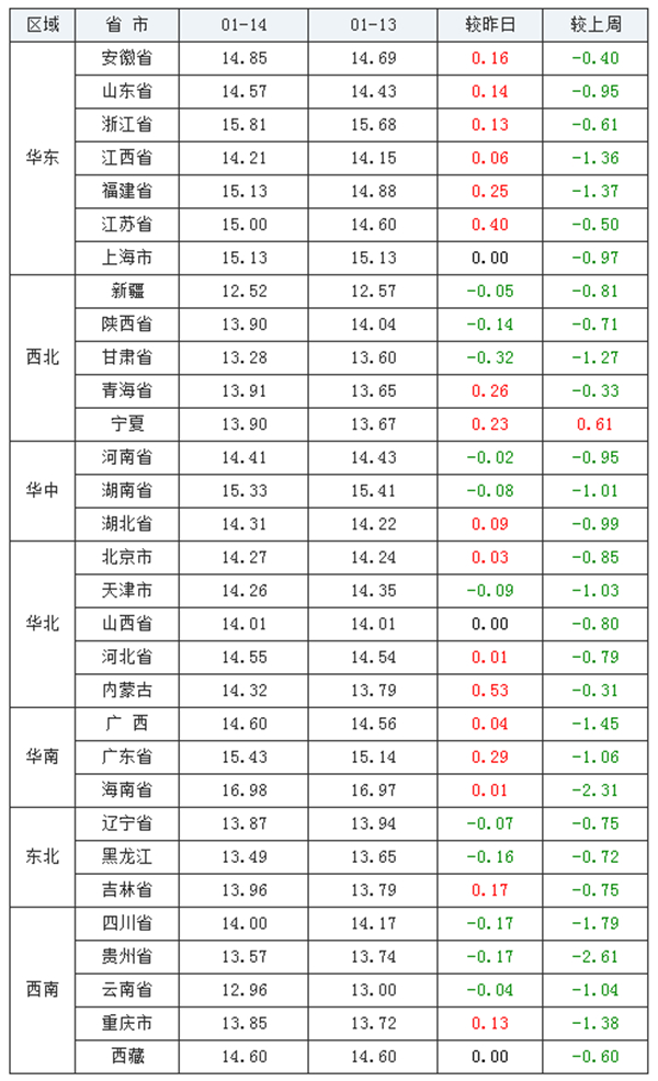 相较昨日(2022年01月13日)14.37元/公斤,价格上涨0.03元/公斤;