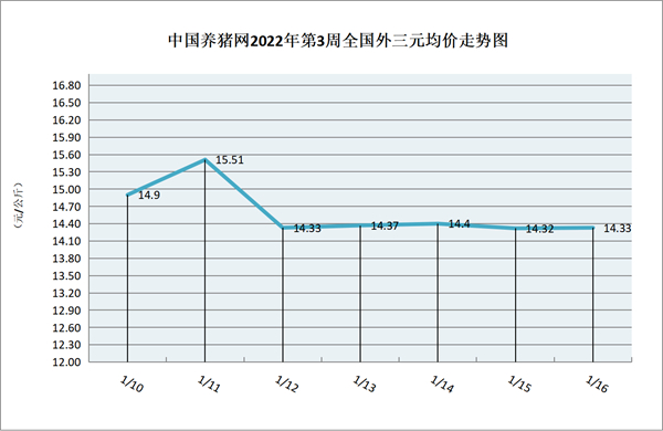 猪价系统数据监测,2022年第3周(2022年01月10日至2022年01月16日)全国外三元生猪价格走势整体呈现涨跌互现的趋势,周中猪价震荡趋稳,周末猪价呈现上涨。本周猪价区间在14.32-15.51元/公斤之间!周初猪价为14.90元/公斤,周末猪价为14.33元/公斤,全周猪价下跌了0.67元/公斤。