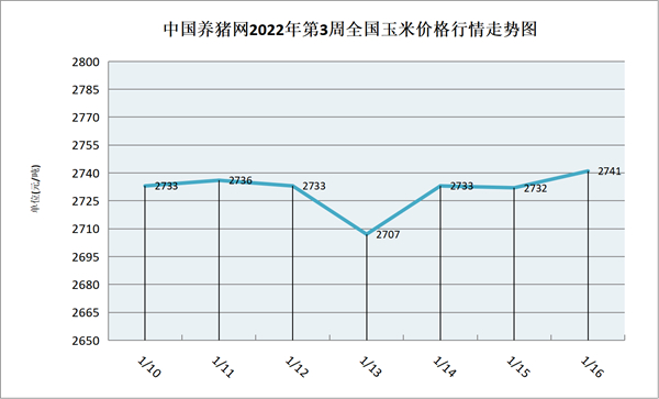 猪价系统数据监测,2022年第3周(2022年01月10日至2022年01月16日)本周我国玉米价格整体呈现涨跌互现的趋势。玉米价格先上涨后又下跌,周中和周末又震荡调整。全周玉米价格区间在2707-2741元/吨,周初期玉米价格为2733元/吨,周末期价格为2741元/吨,全周玉米价格累计上涨了8元/吨。