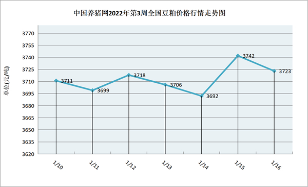 猪价系统数据监测,2022年第3周(2022年01月10日至2022年01月16日)本周豆粕价格周内以涨跌互现为主,周中豆粕价格呈现涨跌互现,周中下跌后又有所上涨,整体呈现涨跌互现。全周豆粕价格区间在3692-3742元/吨之间,周初豆粕价格为3711元/吨,周末价格为3723元/吨,全周豆粕价格累计上涨了12元/吨。