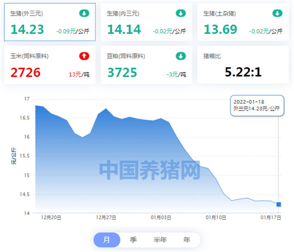 相较昨日(2022年01月17日)14.32元/公斤,价格下跌0.09元/公斤;